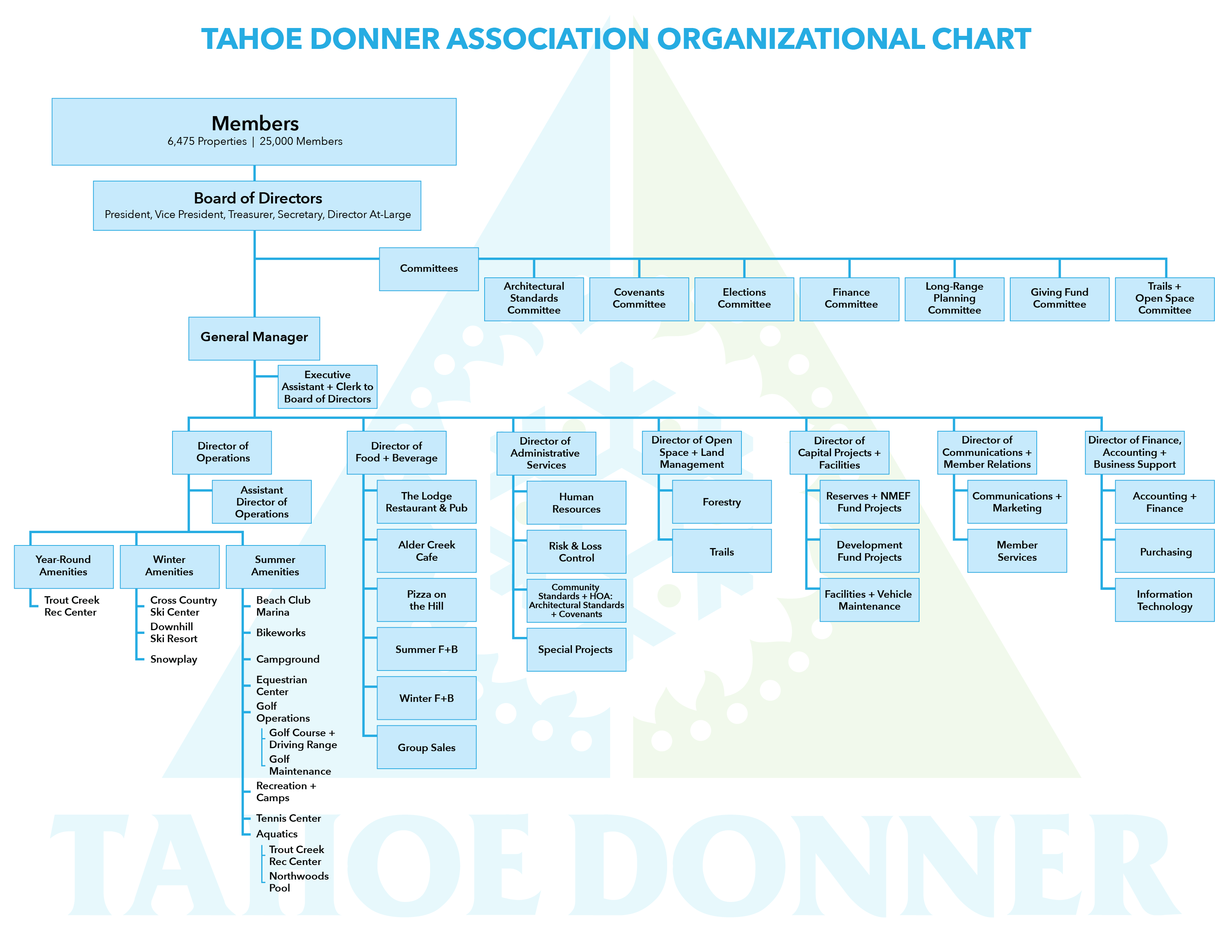 Ever wonder who does what at Tahoe Donner? The board of directors provides oversight and direction; see the organizational chart below.